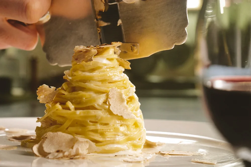Tagliolini with white truffles are perfectly balanced with a young Barolo or a fine Nebbiolo, while black truffles reveal their full character with a Dolcetto or Barbera with a soft, rounded profile.